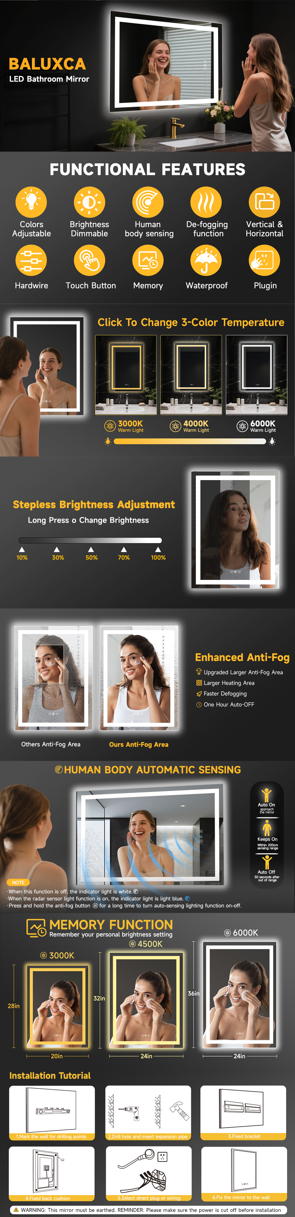 24"X36" LED Bathroom Mirror with Radar body sensing
